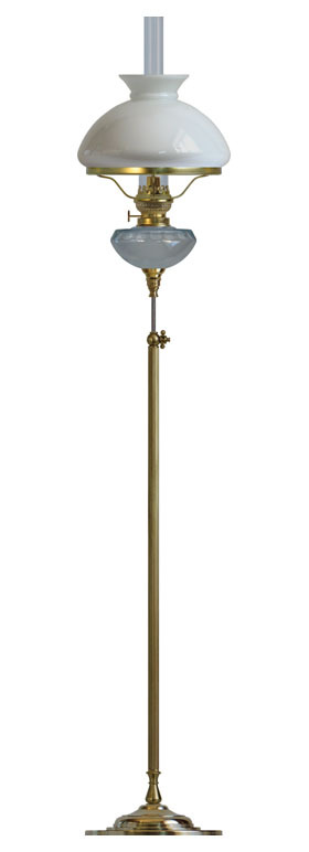 Denna fotogenlampa – eller oljelampa som lamporna ibland lite felaktigt kallas – är tillverkad i solid mässing. Lampglas och eventuell lampskärm munblåses i våra glasformar vid utvalda europeiska glasbruk. Lampan drivs med fotogen – även kallat lampolja – som fylles på genom att dess fotogenbrännare skruvas loss. Ljusstyrkan är beroende av fotogenbrännarens storlek som anges i linjer (’’’), där en linje ungefär motsvarar ljusstyrkan hos ett mindre stearinljus.
