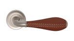 Återfjädrande trycke i läderklädd metall med synliga sömmar.