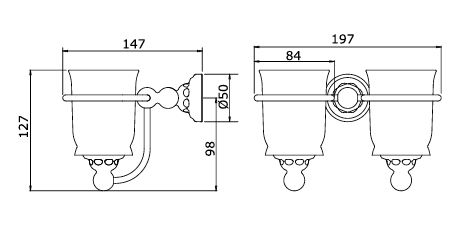 Exklusiv hållare med två muggar för att hänga på väggen av massiv, pläterad mässing med de karakteristiska kullederna som matchar blandare, kranar & övriga tillbehör. Koppar i porslin.